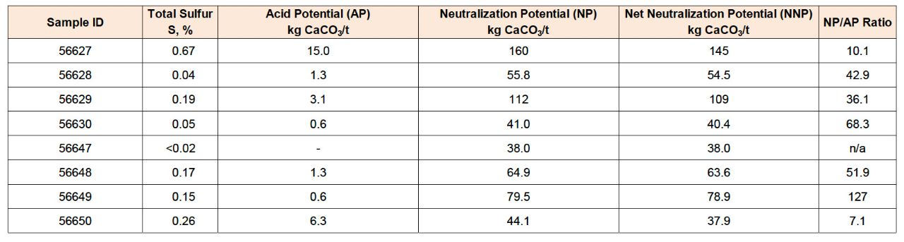 Geochemical characterization is a standard environmental study for metals mining projects. This testwork determines whether any of the different types of rock to be produced by the project have the potential to be reactive (acid-generating leading to metals release) over the long term. Previous limited testwork on a small number of New Amalga wallrock samples conducted in 2020-2021 showed favourable results, demonstrating significant net-acid-neutralizing ratios with all samples tested (Table 1).