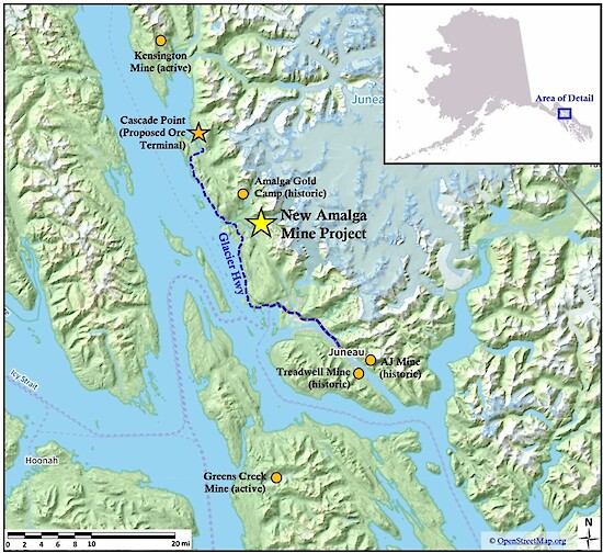 The New Amalga Gold Project remains open to expansion in multiple directions and hosts an Indicated Resource of 1,438,500 ounces of gold at an average grade of 9.47 g/t Au (4,726,000 tonnes) and an Inferred Resource of 515,700 ounces of gold at an average grade of 8.85 g/t Au (1,813,000 tonnes). The current development concept envisions a small-footprint underground mining operation with third-party offsite processing, eliminating the need for an onsite mill or tailings storage facility.